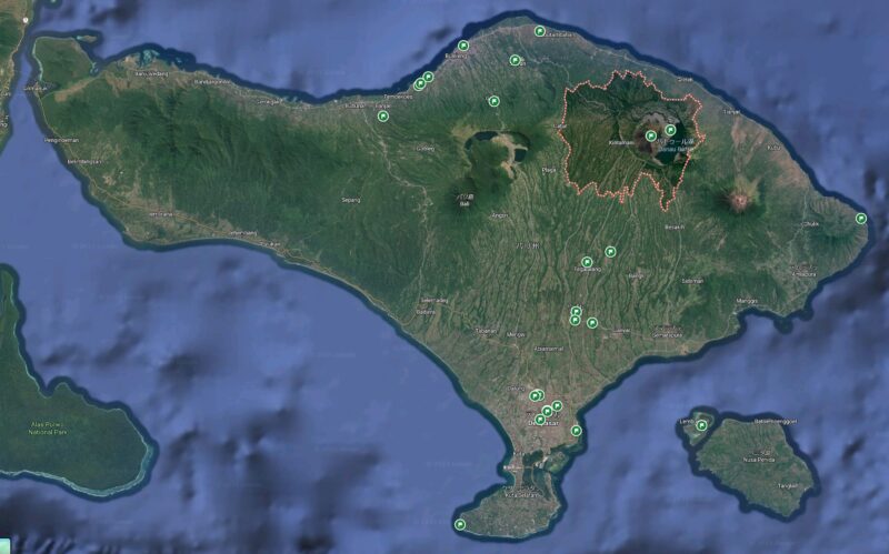 キンタマーニ高原の位置を下図に示す。バリ島の北東部にある。千葉県のマスコット、千葉県をかたどったチーバくんの頭部で言うとキンタマーニ高原の位置はチーバくんの耳の付け根あたり。火山活動によってできた高地を指す。面積や形も我が千葉県と空似。唯一の国際空港は南部デンパサールにあり、成田直行便がある。キンタマーニに行くには車で北上する。北岸に宿をとったが火山の峠を一つ超え、道もつづら折れで良くないので酔うらしい。